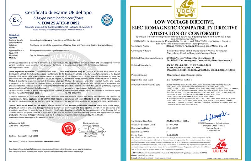 與此同時,ATEX認證(防爆指令認證)是針對在潛在爆炸性環境中使用的設備所進行的專業安全評估。歐洲市場對防爆設備的安全性能要求極為嚴格,ATEX認證不僅要求產品本身性能穩定,還需要企業具備完善的質量管理體系。本次獲得的ECM 25 ATEX-B D092證書,進一步證明了南洋防爆電機在防爆技術、防護等級和質量控制等方面達到了國際認可水平。
